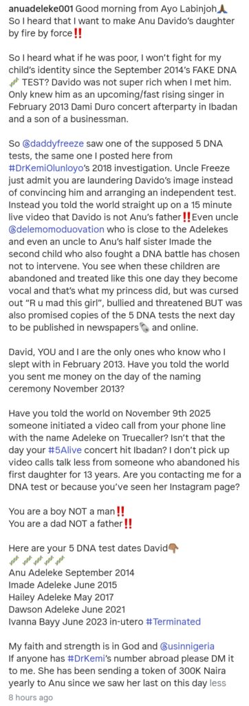 One of the central points of the controversy is Davido’s claim that multiple DNA tests have proven that Anu is not his biological daughter.